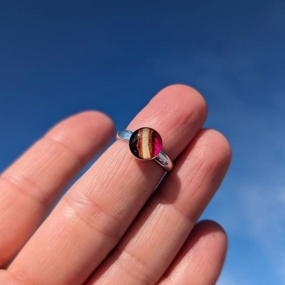Pierścionek z drewna i żywicy to jedn z moich ulubionych wyrobów. Do jego zrobienia wykorzystałam kawałek delikatnej gałązki oraz żywicę barwioną w odcieniach różu i fioletu. Okrągłe oczko zostało oprawione w srebro, pokryte żywicą i wypolerowane na wysoki połysk. Dostępny jest tylko jeden egzemplarz. Być może czeka właśnie na Ciebie?
