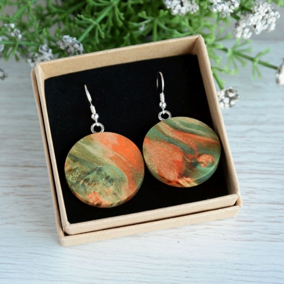 Zielono-pomarańczowe kolczyki XL wykonane zostały z barwionego drewna. Posiadają oryginalny wzór. Kolczyki są duże, a jednocześnie lekkie. Pozwalają wyróżnić się w tłumie. Dostępna jest tylko jedna para.